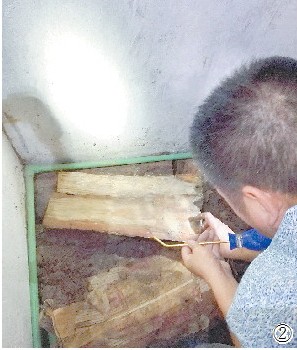 图②把药粉均匀地喷在每段松木上面,捣毁白蚁巢穴。