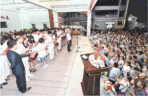 在成才仪式上,准大学生们在全体村民的见证下,举行了集体念村训活动。村干部和家长向准大学生们赠送了文房四宝、家乡泥土,并当场成立了圆梦基金。图为参加成才礼的准大学生们在念村训。