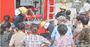 送水现场,当七八十岁的老爷爷、老奶奶前来灌水时,专职消防队员帮老人将水送到家中。