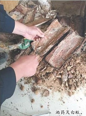 丁丰校扒开潮湿的泥土,看见了稀稀落落的白蚁,三四截锯开的木头露出来后,白蚁数量明显增多。他用小铲子剥开松树皮,上面密密麻麻布满了白蚁,看了很恶心。工作人员立即取来药剂,“杀无赦”!顿时,中招的白蚁“大军”乱成一团,四处逃窜。丁丰校说,这些白蚁一时半会不会死,我们还需要它们跑回巢穴,把药剂带进蚁巢,将以便白蚁连窝端除。