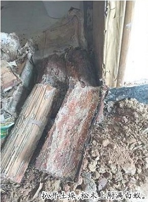 记者跟随丁丰校进入季某家,首先映入眼帘的是客厅、卧室、卫生间门框下方,各堆着一个直径60公分左右的泥垛。丁丰校对记者说:“这是我们为杀灭白蚁而堆起来的土垛,里面埋着松木,目的是引诱白蚁出来啃咬木头,然后喷药予以杀灭。”
