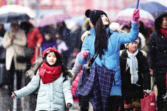 昨天,义乌下起了大雪,给市民出行带来了一些不便:公交车一时变得人满为患;路上的汽车排起了长龙;骑车或步行者小心翼翼地前行……但降雪也给人们带来了一些乐趣:在飞舞的雪花里,不少人自得其乐,陶醉其中。