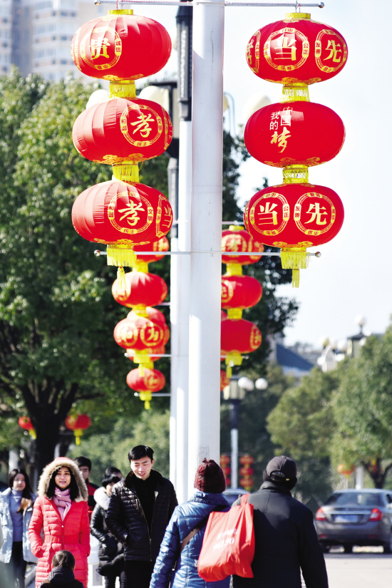 “好喜庆好漂亮,这里挂满了红灯笼。”“街头的年味越来越浓了。”近日,义乌县前街等路段挂起了火红的灯笼,灯笼上印有“我的中国梦”、“孝当先”、“和为贵”等字样,串联起一道靓丽的风景线,洋溢着浓浓的年味。