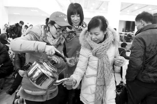 此外,来自四季风志愿者大队的二三十名志愿者,也为等待上车的乘客送上了一杯杯热腾腾的姜茶。据悉,1月18日~2月2日,四季风志愿者每晚都会按时出现在火车站送姜茶,每天大约送出2000杯姜茶。他们中,还有一些小学生志愿者。四季风志愿者“绿叶”表示,晚上气温低,尤其这几天,乘客购票、候车都比较辛苦,“喝一杯热姜茶有助于防寒保暖、消除疲劳,让他们带着义乌的温暖回家。”