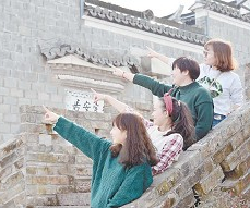 大年初五,佛堂古镇的民俗古建筑群,选择徒步游览的女孩们摆造型拍照。春节期间,不少市民选择低碳文明出行方式,欢度新年。