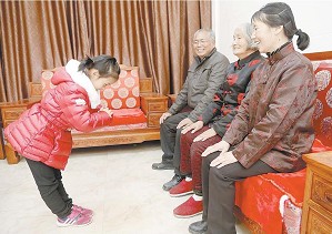 稠江一小学生参与《我给长辈鞠躬拜个年》寒假实践活动。