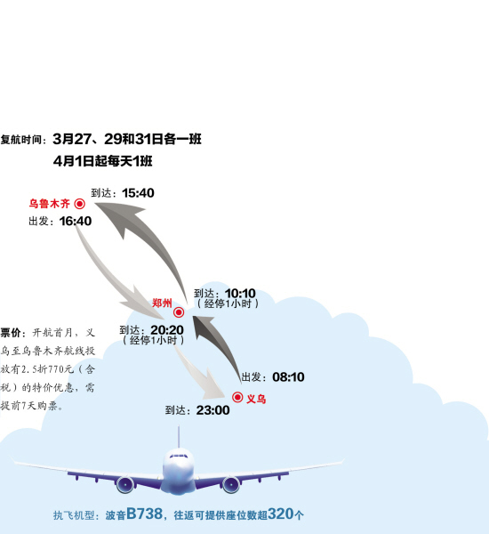 昨天,记者从义乌机场获悉,周日起,义乌至乌鲁木齐航线将复航,这是该航线自2013年6月停航近2年来重新开航。