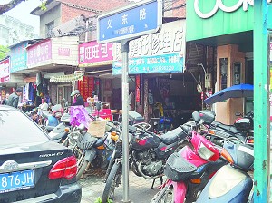 义东路是该社区的主要通道之一。昨日上午,记者来到义东路三岔口段,发现道路坑坑洼洼,道路两侧沿街店面有好多招牌广告已经破损,成条成块地随风飘荡,几乎所有沿街店面都在超门店占道经营,原本就不宽敞的人行道全被“占领”了。在邮政营业厅附近,一经营制暖建材的店家将一堆三四米长的制暖材料横放在人行道上,行人只好“躲”着走。义东路三岔口边,一摩托车修理店门口的人行道上至少停放着20辆废旧摩托车、电动车,店主就在人行道上铺开修车。义东路邮政营业厅后面有一个菜市场,通向菜市场的小道上污水四溢,臭气熏天。