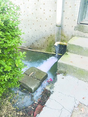 在词林小区15幢106号门前,记者看到一雨水管里正在向外排放大量乳白色液体,顺着地势流进旁边的绿化带。这样的情形在词林小区并不少见,有的一楼居民将阳台上洗衣服的污水排入绿化带中,有的将水管接到车库门前洗东西,污水四处流淌。