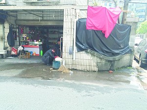 随后,记者又来到诗园小区,见到3幢一间车库被用来经营小卖部,一位居民正在小卖部门前洗东西,污水流进了雨水窨井。在诗园小区,车库被挪作他用的情况很普遍。有一间车库门口停着三轮车,堆着一些蔬菜和篮子,记者走进该车库一看,一位老奶奶在昏暗的灯光下做手工活。这车库不大,蔬菜、来料加工的材料、床、燃气灶都挤在里面,仅一条小路可供一人进出,存在较大的消防安全隐患。