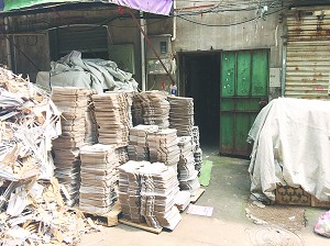 再往里走,市场弄又有些变化,一层的房屋主要用来当仓库或者成了小型加工厂,以包装印刷配套加工厂为主。这里的房屋面积都不大,一个小型加工厂需要租用多个店面,但还是满足不了租客的需求,于是大量纸板、废料就堆积在道路上,有几条工厂集聚的小路早就被堆得水泄不通。记者还发现,有一些小型加工厂设在饭店边上,一旦发生火灾,后果将不堪设想。