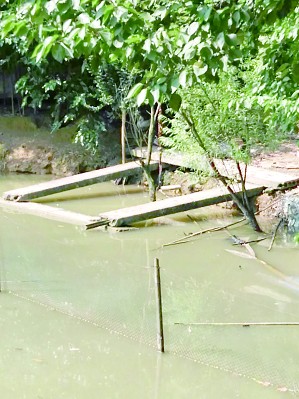 随后,记者走进村内,在466号、469号门牌的村居前,看到有一口比村口那池塘大一倍左右的池塘,里面的水确实比村口的脏多了,水色更灰暗,水中不时冒出一串串气泡。在池塘一角的水面上,漂着两条死鱼,被往上冒的气泡“顶”得团团转。记者在这口池塘的几个角落都发现了一些垃圾堆、枯枝烂叶等。再往前走,在482号门牌的村居前又是一口池塘,面积不大,也有点脏,四周还堆有大量腐烂的垃圾,以及一些建筑垃圾。转个弯,沿村中小道继续往前走,走不了几分钟,出现了一口水体呈暗红色的池塘。这口池塘位于门牌号为353号的村居附近,池塘边有不少垃圾,还不断从一根根排水管中流出泛白的水,直接注入池塘中;该池塘的另一端,有人用丝网拦起一块水面,饲养着一些鸭子、鹅等家禽。