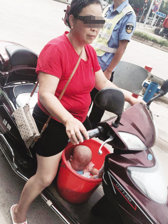 据了解,这名女子姓于,义乌义亭人,塑料桶内的小男孩是她九个月大的儿子。当天上午,于某准备带儿子去义亭镇一家医院做健康体检,因嫌坐公交车去不方便,一只手抱着小孩骑电动自行车又不妥。于某思来想去,索性就从家里拿来一只塑料桶,把儿子“塞”了进去,放在电动自行车的脚踏板上,匆匆骑着车就上路了。