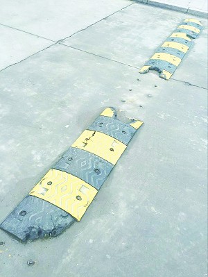近几天,不少读者来电反映,街头一些路段的减速带破损严重,只留下两排钢钉,人们开车经过时个个提心吊胆。