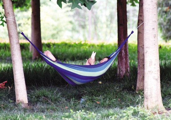 昨天上午8时许,记者在义乌福田湿地公园看到,有市民在树木间挂了吊床,躺在上面避暑,过路的陈姓市民说,如此避暑影响树木的正常生长,看起来也不雅观。