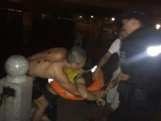 可是,救生绳索不能承受两个人重量,无法通过绳索直接拉上桥面。楼仁斌就抱住该男子,在桥上的队员绳索的拖引下,两人安全到了岸边。
