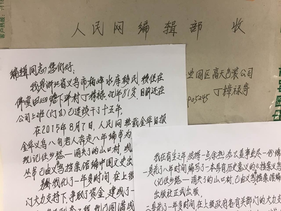 人民网北京1月10日电2015年8月,人民网全文转载了《金华日报》刊登的浙江省义乌市“八旬老人丁樟禄奔走八年编书为留住乡愁”的感人事迹。近日,老人向人民网写来亲笔信,表示在各方支持下,自己所编写的《记住乡愁——消失了的山口村》已正式出版,同时“山口村遗址”纪念碑及配套工程已圆满完成。