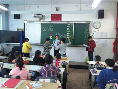 义乌实验小学江南校区五(11)班为了迎接法制宣传日的到来,增强同学们的法制意识,更好地做到“知法、懂法、用法”,组织了法治角色扮演游戏。提前一天,用抽签的方式分别决定了每组的角色名称——警察与小偷、交警与肇事者、城管与小摊贩。同学们积极准备,自编、自导、自演了法治小品。
