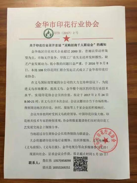 核心提示:为促进义乌市场繁荣,金华地区印花行业的良性发展,提高义乌、金华整个地区的印花行业技术水平,品质控制能力,实现协会会员的价值。拟定于2017年2月24日在义乌召开本次会议。本次会议将重点邀请义乌及周边地区印花、纺织、服装等千余家加工厂参与。