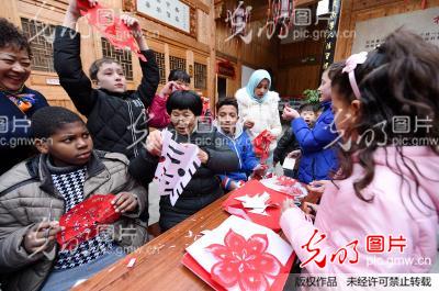 2017年01月15日,外国小朋友在剪纸艺人的指导下学剪窗花。